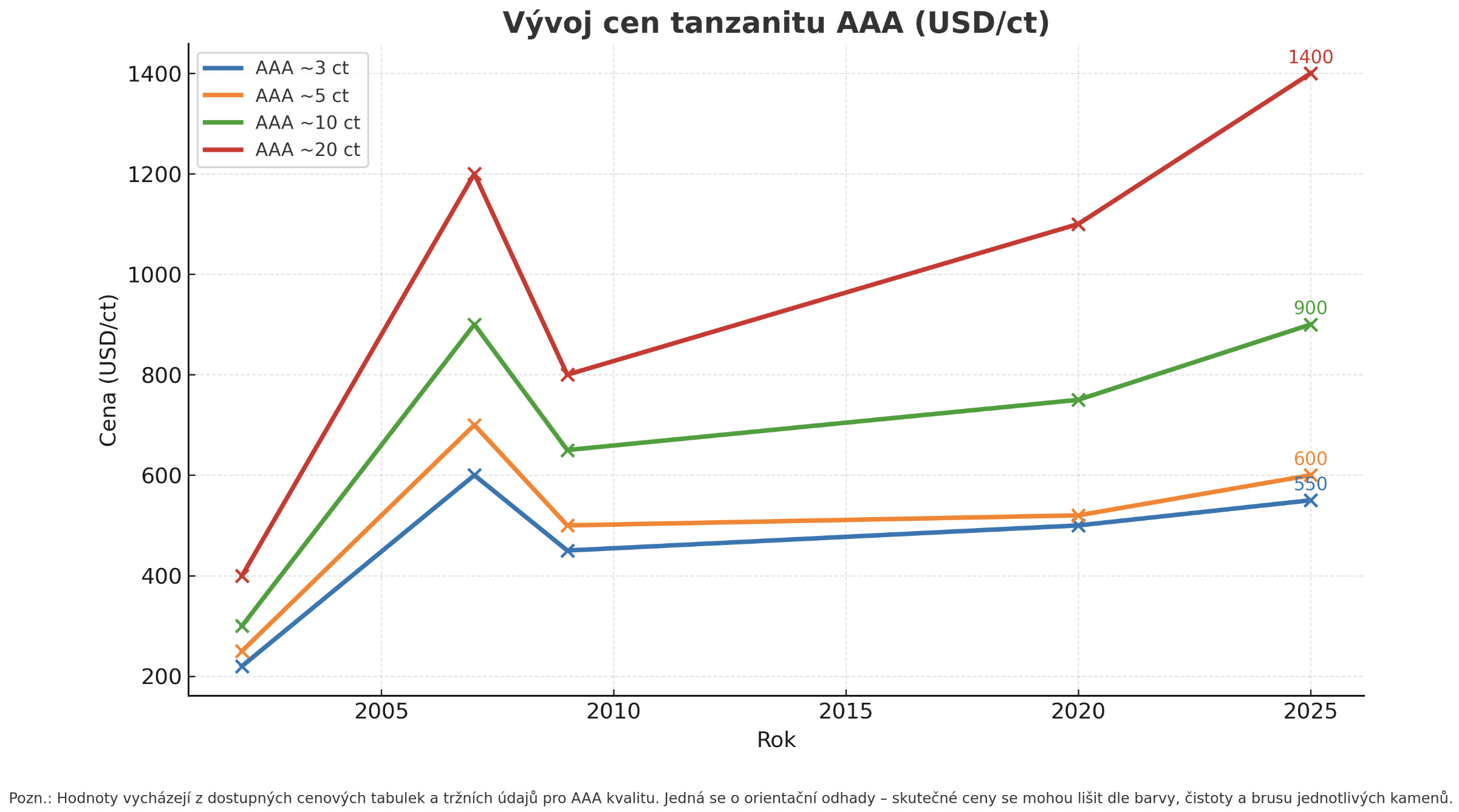 Například tanzanity o váze 10+ ct ve špičkové kvalitě dnes dosahují cen v řádech tisíců USD za karát, což bylo před 10–15 lety výjimečné.