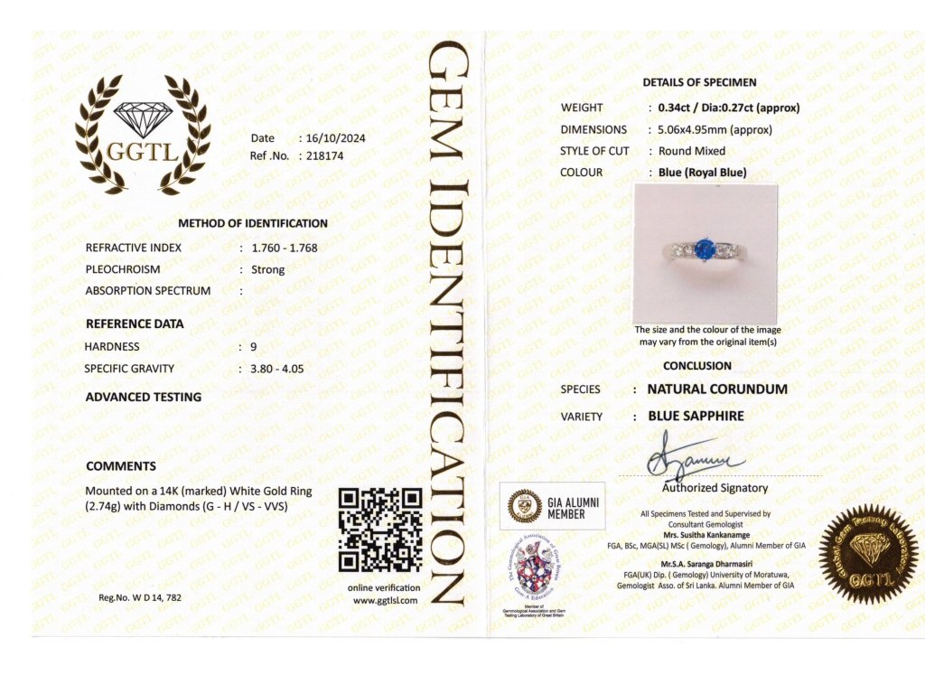 Prstýnek z bílého 14 karátového zlata zaujme na první pohled nádherným centrálním kamenem, kterým je přírodní modrý safír v nejžádanější královské modré barvě (Royal Blue) s nádhernou brilancí o váze 0,34 ct (cca 5 mm). Tento drahokam je přichycen šesti krapnami a obroučku prstenu zdobí 4 diamanty briliantového brusu barvy G-H a čistoty VS-VVS o váze 0,27 ct.