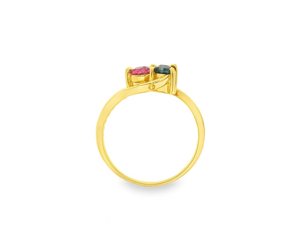 Tento okouzlující prsten z 14K žlutého zlata je osazen dvěma vzácnými přírodními safíry – jedním v sytě růžovém a druhým v zářivě modrém odstínu. Safíry o celkové hmotnosti 0,73 ct se díky svému kulatému brusu nádherně třpytí a vytvářejí dokonalý kontrast barev. Na obroučce prstenu jsou pečlivě zasazeny diamanty vysoké kvality (G–H / VS–VVS), které podtrhují luxusní charakter tohoto šperku.