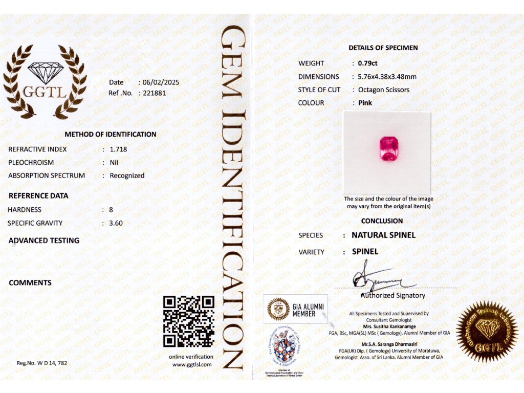 Tento certifikovaný přírodní růžový spinel o váze 0.79 ct zaujme svou jemnou růžovou barvou, která působí elegantně a živě. Kámen má precizní osmiúhelníkový brus (Octagon Scissors), který zvýrazňuje jeho brilanci a čistotu. Díky své tvrdosti 8 na Mohsově stupnici patří mezi odolné drahokamy, což z něj činí ideální volbu pro luxusní šperky.
